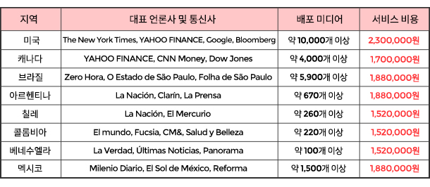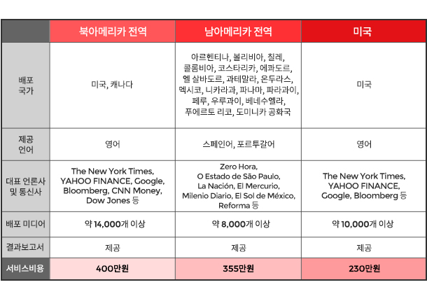 - *해당 서비스 구성표는 400단어 이하의 보도자료와 사진1장을 포함한 비용입니다. 길이 및 사진이 추가 될 경우 서비스 비용이 추가됩니다.